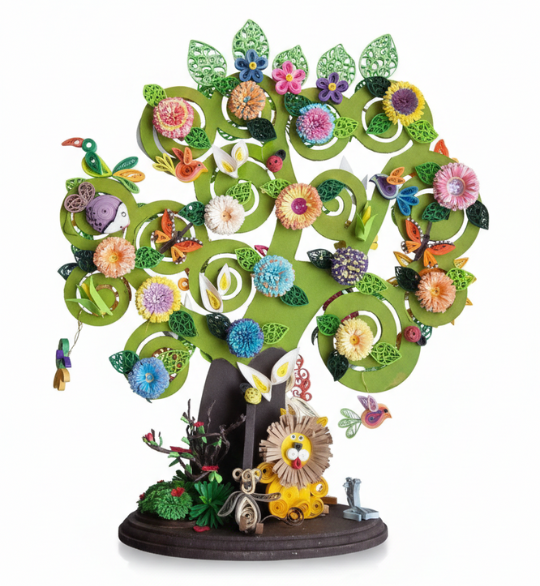 Base de madera con diversas figuras de filigrana en colores vivos , artesanía mexicana 26 cm de altura x 24 cm de ancho.
