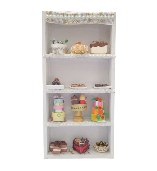 Base de madera con 3 divisiones de 22 x 10 cm pintada en blanco con figuras de filigrana pastelitos.
